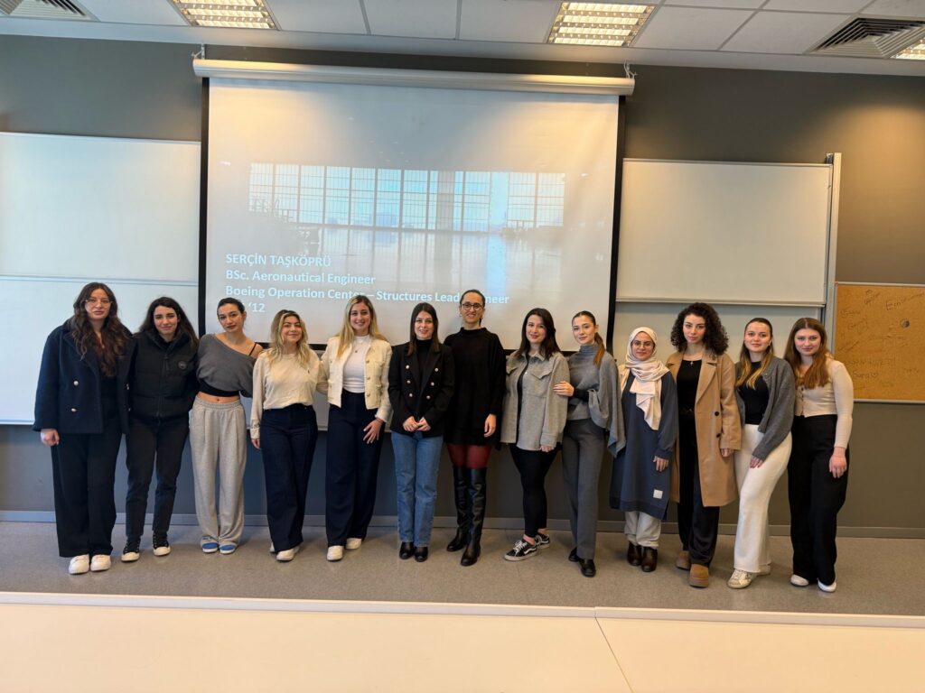 Özyeğin Üniversitesi’nde yürütülen “Havacılıkta Sürdürülebilirlik” dersi kapsamında, Üniversitemiz Toplumsal Cinsiyet Eşitliği Uzmanı Arca Begüm Bayır, “Havacılıkta Kadın” başlıklı sunumuyla derse konuk oldu. Bayır, havacılık sektöründe kadınların toplumsal cinsiyet eşitsizliği temelinde karşılaştıkları sorunlara değinerek, öğrencilerle bu konudaki çözüm önerilerini ve yapılması gerekenleri tartıştı. Aynı dersin devamı niteliğinde olan bir sonraki oturumda, dersin yürütücüsü Sena Kılıç ve Arca Begüm Bayır, Bayır’ın teorik düzlemde paylaştığı bilgilerin sektördeki yansımalarını gösterebilmek amacıyla, Boeing’te yönetici olarak görev yapan Uçak Mühendisi Serçin Taşköprü’yü konuk olarak davet etti. Daveti kabul eden Taşköprü, üniversitemize gelerek havacılık öğrencileriyle bir araya geldi; sektörde bir kadın olarak edindiği deneyimlerini paylaştı ve öğrencilere iş yaşamına ilişkin değerli tavsiyelerde bulundu.